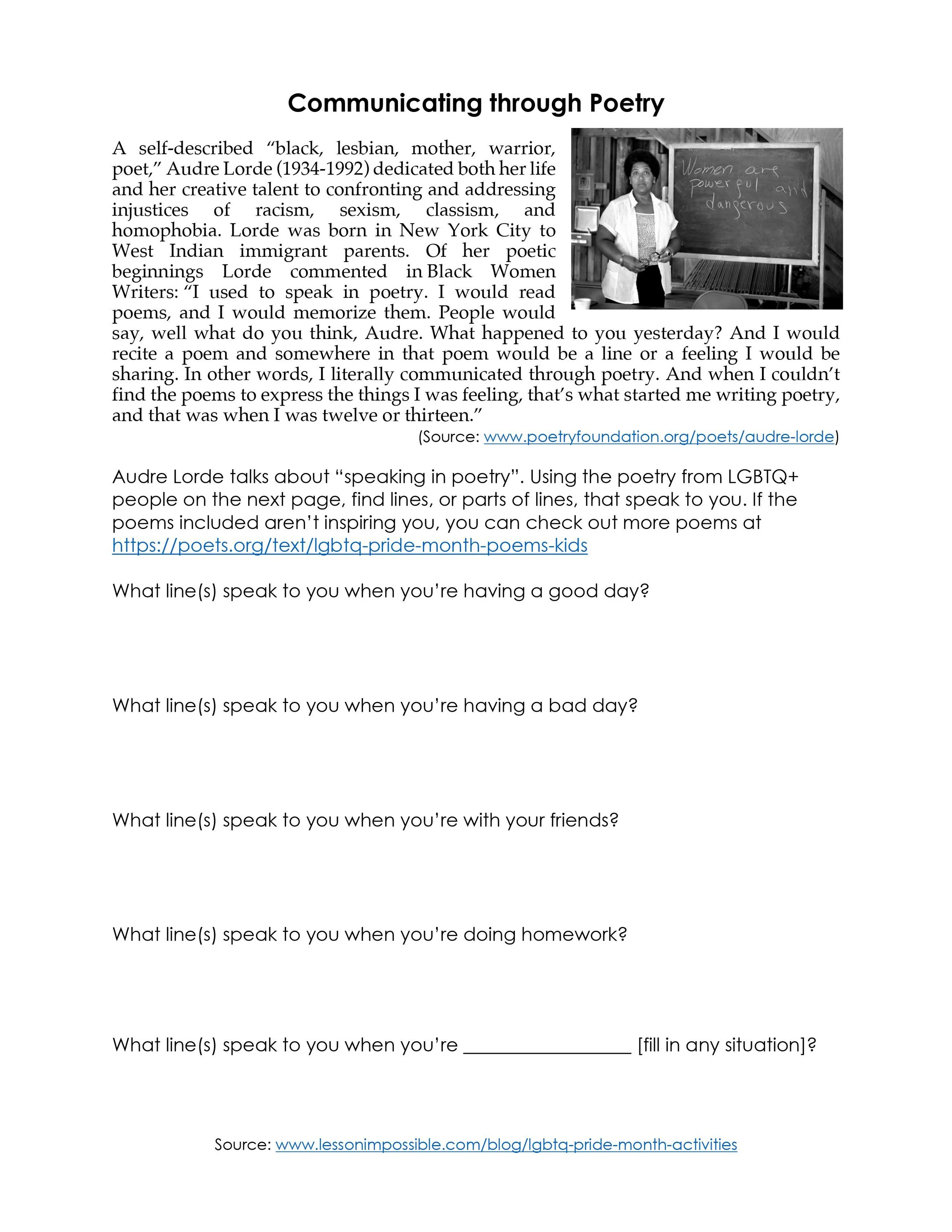 I found an amazing Audre Lorde quote and it inspired me to do an activity where students explore LGBTQ+ poets’ poems to find lines that communicate feelings and moments in their lives. I was able to find some (new-to-me) poets from a variety of backgrounds, including one haiku poem that I found on Twitter!